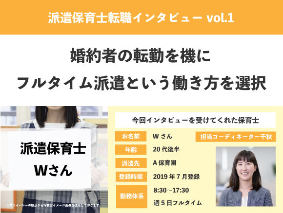 今回は、婚約者のお仕事の都合で一時的に関東に引っ越してきた事をきっかけに、派遣保育士として働き始めたWさんにインタビューを行い、派遣保育士として働くきっかけや、派遣保育士という働き方を選んだ理由、働いてみた率直な感想などをざっくばらんに聞いてみました。