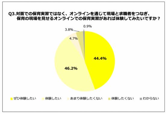 「Q3.対面での保育実習ではなく、オンラインを通じて現場と求職者をつなぎ、保育の現場を見せるオンラインでの保育実習があれば体験してみたいですか?」(n=106)と質問したところ、「ぜひ体験したい」が44.4%、「体験したい」が46.2%という回答となりました。